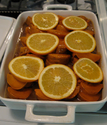 I halve the glaze recipe from above (keeps the dish lighter and not as sweet); squeeze juice from fresh oranges all over the yams and let soak before adding the glaze (the citrus adds freshness and zeal); then lay thin slices (circles, halves, or quarters) of oranges over the top before baking (they cook up deliciously).